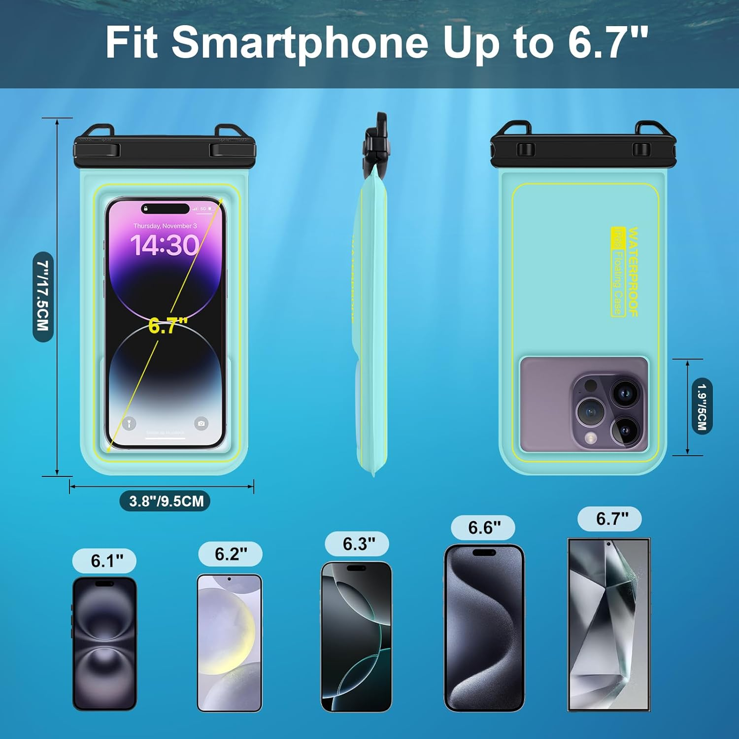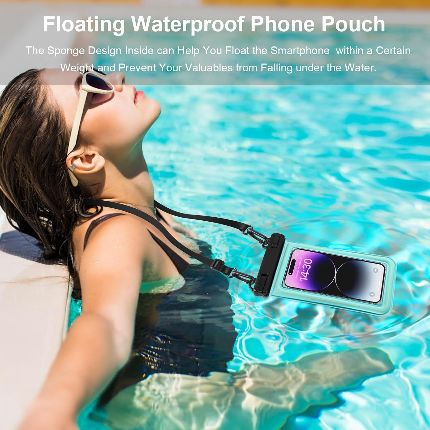The 6.9-inch large space can easily fit a mobile phone; it is IP68-rated truly waterproof, safe enough for swimming and snorkeling; the built-in floating sponge will automatically float up when it falls into the water, allowing you to play on the beach or in the pool as you like.